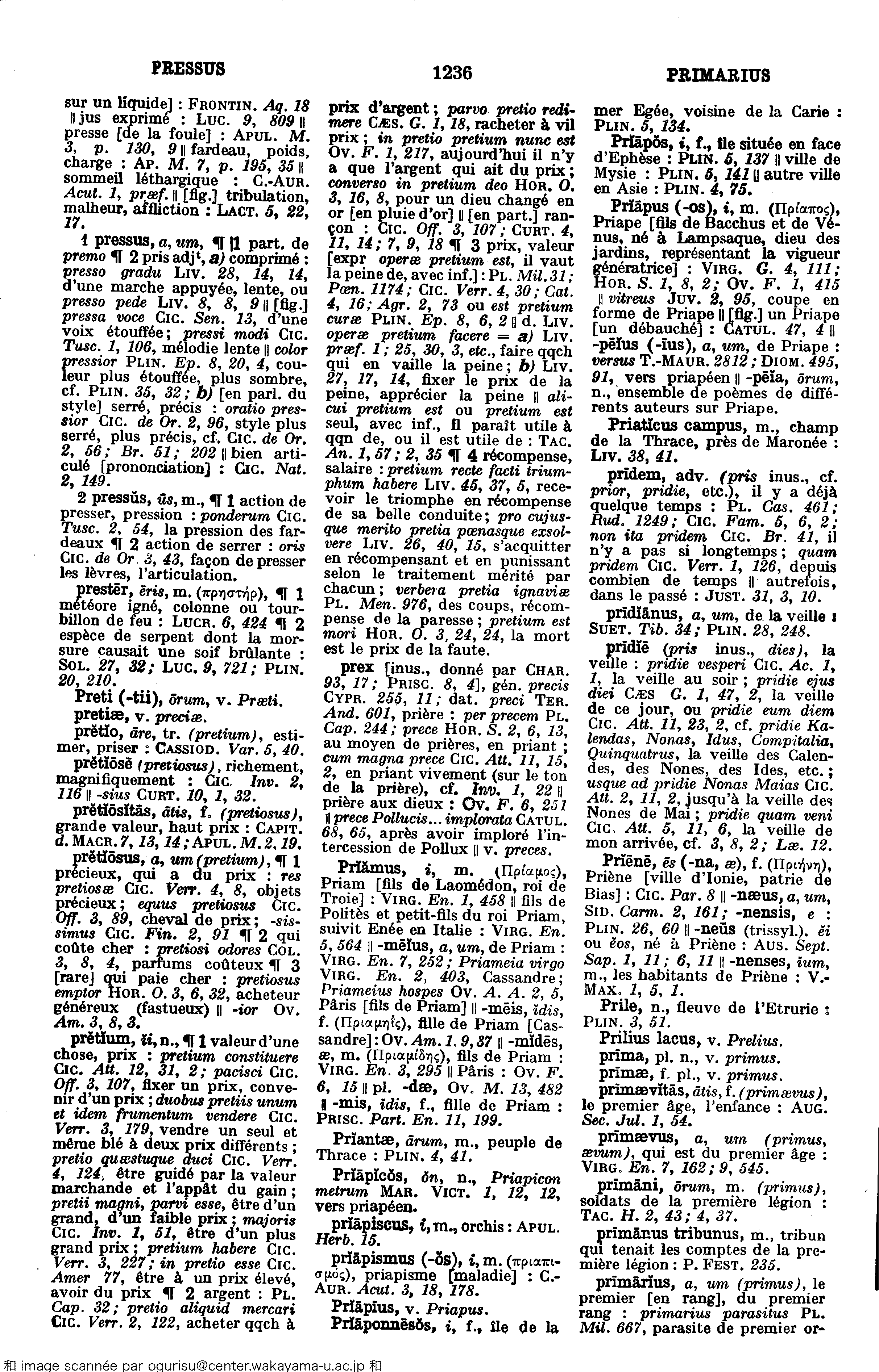 Prĭāpus (-os), ī, m. (Πρίαπος), Priape [fils de Bacchus et de Vénus, né à Lampsaque, dieu des jardins, représentant la vigueur génératrice] :