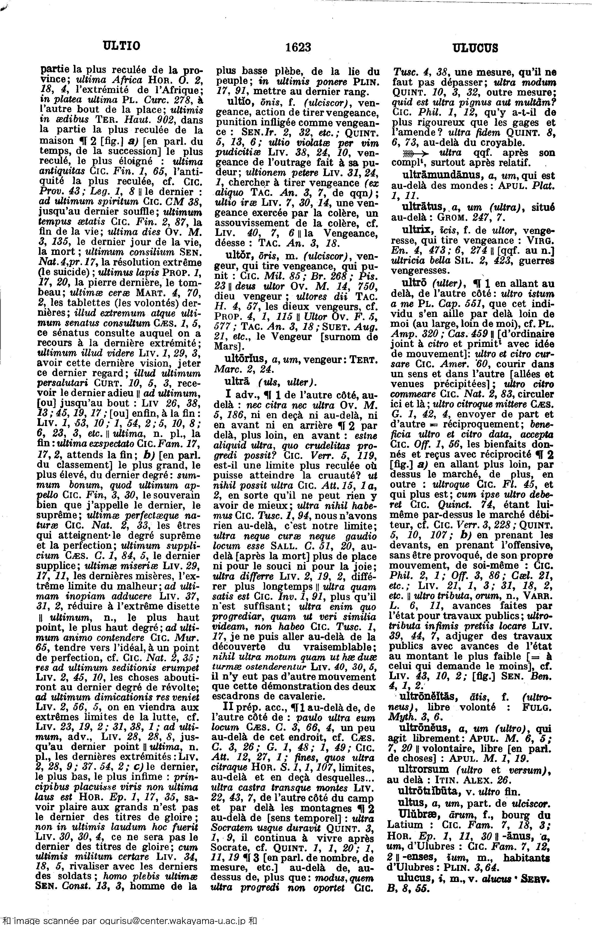 ultĭō, ōnis, f. (ulciscor), vengeance, action de tirer vengeance, punition infligée comme vengeance :